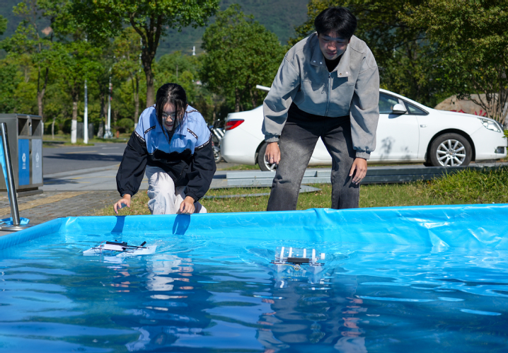 本次活动恰逢临近学校校庆,青年大学生们在自制的船模空白处写下一句句对学校的真挚祝愿。座谈结束后,还举行了思政领航馆首场大学生科创活动——帆船竞速比赛,现场氛围热烈。