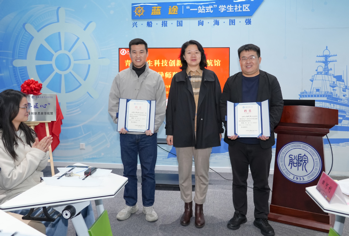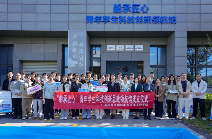 嵇春艳等领导共同为“‘船’承匠心”青年学生科技创新思政领航馆揭牌,标志着学校这一融合思政教育与科创实践的崭新育人阵地的正式启用。“‘船’承匠心”青年学生科技创新思政领航馆由“深蓝之光”船舶科技作品舫、“云帆智航”船舶科技创新工作舫、“蓝途”一站式学生社区、“‘船’承领航”辅导员工作室四大板块组成,集中展示了国家海洋强国重要战略、江科大校友“以青春铸船魂”的系列奋斗故事以及优秀学子科技创新作品;同时,思政馆的建成,也是学校“一站式”学生社区建设的重要延伸,使得思政教育、学业指导、科创支持“融入日常、浸润成长”,社区育人功能“精准落地”。