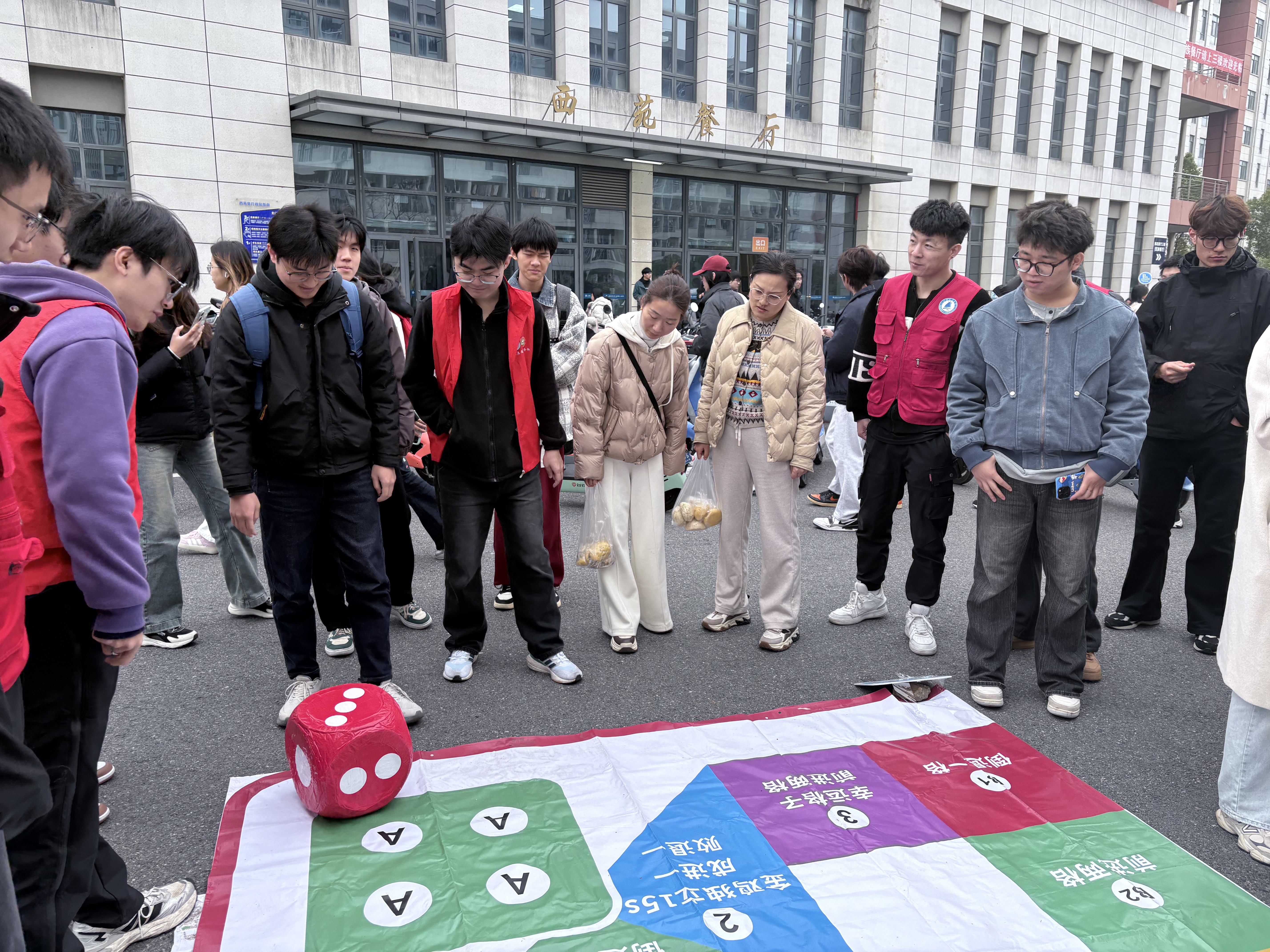 活动现场设置五大特色体验区,将知识科普与趣味游戏深度融合。“知水小挑战”答题区人气十足,师生扫码即可参与答题,5道题目包含基础节水常识与江苏本地水资源省情、校情内容,让大家在答题中快速掌握实用节水知识。一旁的“节水大富翁”游戏区更是排起长队,参与者投掷巨型骰子,在地面铺设的大幅地图上前进,根据格子提示完成“说出3个校园节水小技巧”“模仿节水动作拍照”“领取节水宣传页”等小任务,轻松活泼的形式让节水知识变得可感可知。